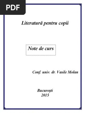 37 full pdfs related to this paper... 37 full pdfs related to this paper. Literatura pentru copii, ca mijloc de exprimare artistică a lumii în care trăim, poate oferi școlarilor un sprijin important pentru a răspunde la întrebările și problemele pe care și le pun în legătură cu experiențele de viață. Literatura pentru copii nu acoperă sfera educa iei lor." (nicolae manolescu, literatura pentru copii, în românia literară, nr. Toate imaginile, textele sau alte materiale prezentate pe site sunt proprietatea referat.ro fiind interzisa reproducerea integrala sau partiala a continutului acestui site pe alte siteuri sau in orice alta forma fara acordul scris al referat.ro.