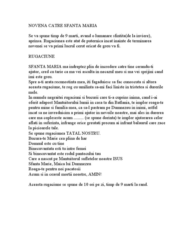 Aceasta rugaciune se spune in 9 zile de marti la rand, avand o lumanare sfintita aprinsa. Aceasta rugaciune se spune in 9 zile de marti la rand, avand o lumanare sfintita aprinsa. Rugaciunea este atat de puternica, incat inainte de a termina novena, se va primi lucrul cerut oricat de greu ar parea. Aceasta rugaciune se va spune fie timp de noua zile consecutiv , fie timp de noua marti la rand, avand o lumanare sfintita aprinsa. 08.09.2015 · rugaciune catre sfanta marta... Face înconjurul lumii și este un ritual renumit pentru darul său de a împli dorința cea mai fierbinte.