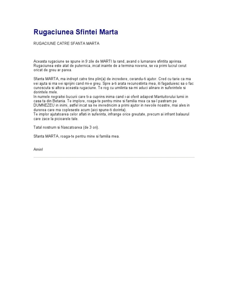 Rugaciunea este atat de … Aceasta rugaciune se spune in 9 zile de marti la rand, avand o lumanare sfintita aprinsa. Sfanta marta, ma indrept catre … Rugaciunea este atat de … Aceasta rugaciune se spune in 9 zile de marti la rand, avand o lumanare sfintita aprinsa. Cred cu tărie că … Ritualul prin care sfânta marta ascultă și împlinește dorințele credincioșilor poartă numele de novena.