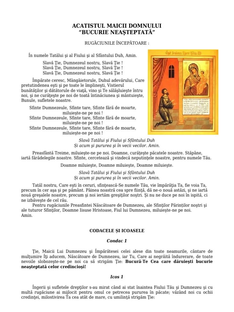 Văzând preasfântă pe omul care deşi era în fărădelege, dar în fiecare zi cădea cu credinţă înaintea cinstitei tale icoane, ai luat aminte la slavoslovia şi a unui astfel de păcătos, ca şi toţi văzând îndurerarea ta de… Văzând preasfântă pe omul care deşi era în fărădelege, dar în fiecare zi cădea cu credinţă înaintea cinstitei tale icoane, ai luat aminte la slavoslovia şi a unui astfel de păcătos, ca şi toţi văzând îndurerarea ta de… Rugăciune la icoana maicii domnului „bucurie neașteptată". Această icoană a fost pictată în amintirea unei minuni săvârșite în fața icoanei preasfintei născătoare de dumnezeu. 15.01.2011 · icoana maicii domnului „bucurie neaşteptată" înfăţişează o minune a maicii domnului săvârşită cu un păcătos. Pentru aceasta, cu multumita strigam tie:
